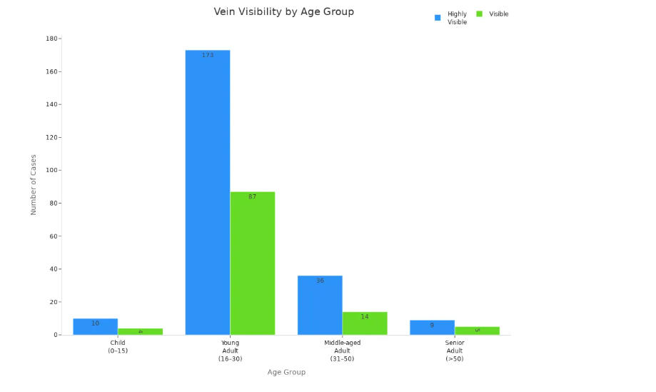 Vous constaterez peut-être que la technologie de visualisation des veines ne donne pas toujours les mêmes résultats pour chaque patient. Plusieurs facteurs peuvent influencer la qualité de la visualisation des veines et la réussite des ponctions veineuses. L'âge et le teint de la peau jouent un rôle majeur dans la visibilité des veines. Les jeunes adultes ont généralement des veines plus visibles que les personnes âgées et les enfants. Le tableau suivant illustre l'influence de l'âge sur la visibilité des veines :
