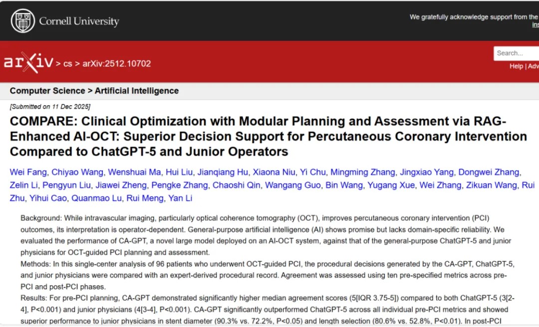 16 décembre 2025 | Shaanxi, Chine — L’hôpital Tangdu, affilié à l’université de médecine de l’armée de l’air, en collaboration avec l’institut de recherche de l’université Tsinghua de Shenzhen, a annoncé la validation clinique de CA-GPT, un système d'aide à la décision par IA pour la tomographie par cohérence optique (OCT) guidée intervention coronarienne percutanée (ICP)Les résultats sont présentés dans la prépublication. « COMPARER : Optimisation clinique avec planification et évaluation modulaires via l'IA-OCT améliorée par RAG : Aide à la décision supérieure pour l'intervention coronarienne percutanée par rapport à ChatGPT-5 et aux opérateurs juniors. »