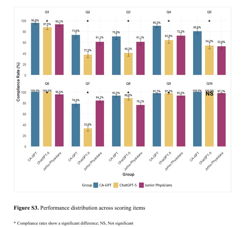 ●Planification pré-PCI :Lors de la planification préopératoire, Le CA-GPT a obtenu un score d'accord médian de 5 (sur 5)., surpassant nettement ChatGPT-5 (score médian : 3)et médecins juniors (score médian : 4).