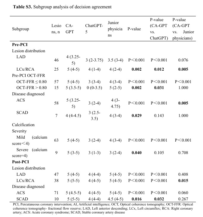 ●Robustesse dans des scénarios complexes :Les analyses de sous-groupes ont indiqué que l'avantage du CA-GPT était le plus marqué dans les contextes les plus difficiles, notamment lésions ischémiques significatives (OCT-FFR ≤ 0,80)et ACScas.