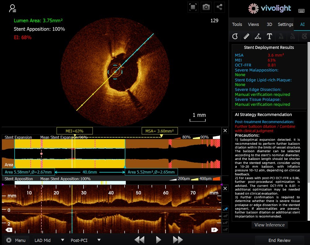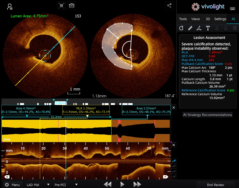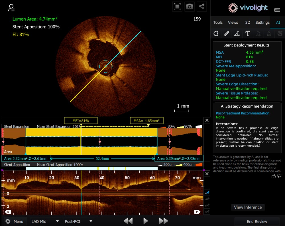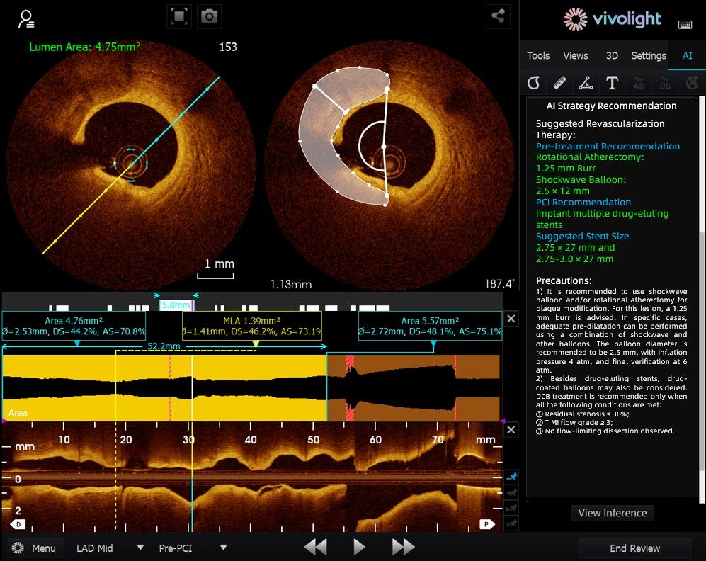 Developed based on Vivolight Medical’s OCT system, the AI-OCT is a next-generation intelligent decision-support system for intravascular imaging. It integrates scattered intravascular imaging diagnostic data—including lumen diameter, culprit lesions, OCT-FFR, and plaque natures—into comprehensive treatment strategies and actionable recommendations. As an independent research software embedded in the OCT platform, it is co-developed with various hospitals to create customized versions tailored to specific clinical needs.
